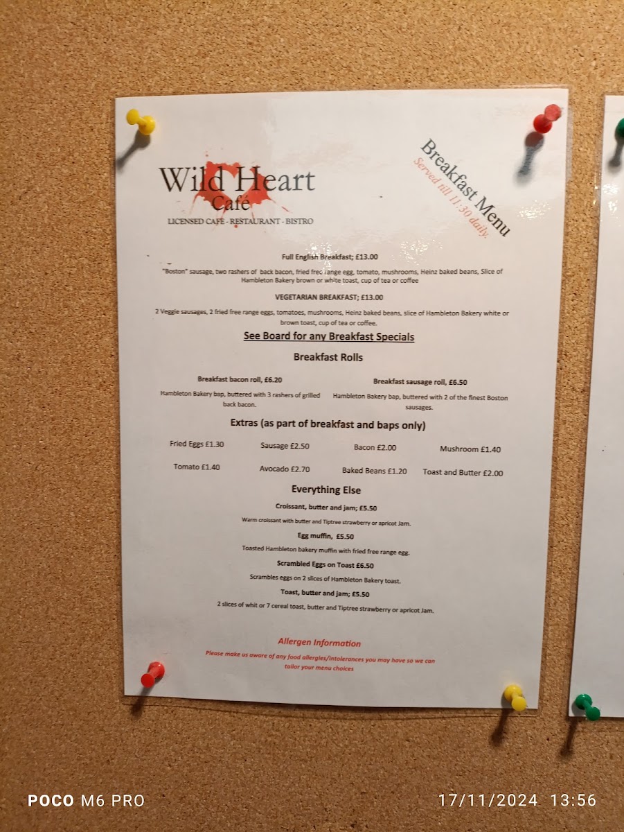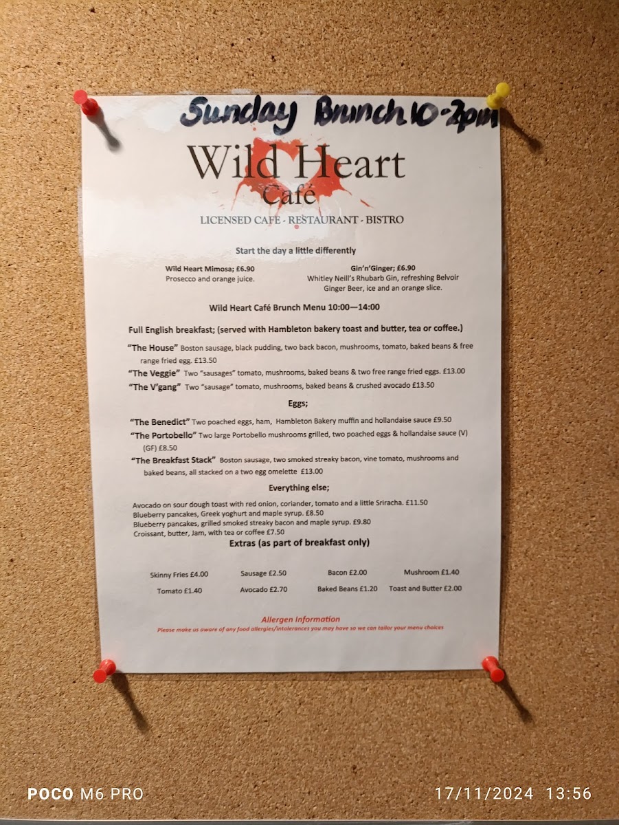 The menu at Wild Heart Café offers a delightful variety of beverages to suit all tastes. For hot drinks, guests can enjoy a selection including Espresso, Cappuccino, Latte, Flat White, and Americano. Cold drink options are equally tempting, with Coke, Folkington Apple Juice, Belvoir Presse, and Posh Pops, along with still or sparkling Mineral Water. For those seeking something more unique, the café features specialty drinks like the Chai Latte, Beetroot Latte, Turmeric Latte, Iced Coffee, and Coffee Frappe. Additionally, the café offers refreshing fruit-based beverages, such as Coco Loco, Pash 'N' Shoot, Strawberry Split, Blueberry Thrill, and Big 5, perfect for a sweet, revitalizing treat. Whether you’re after a classic coffee or a refreshing fruit drink, Wild Heart Café has something for everyone.